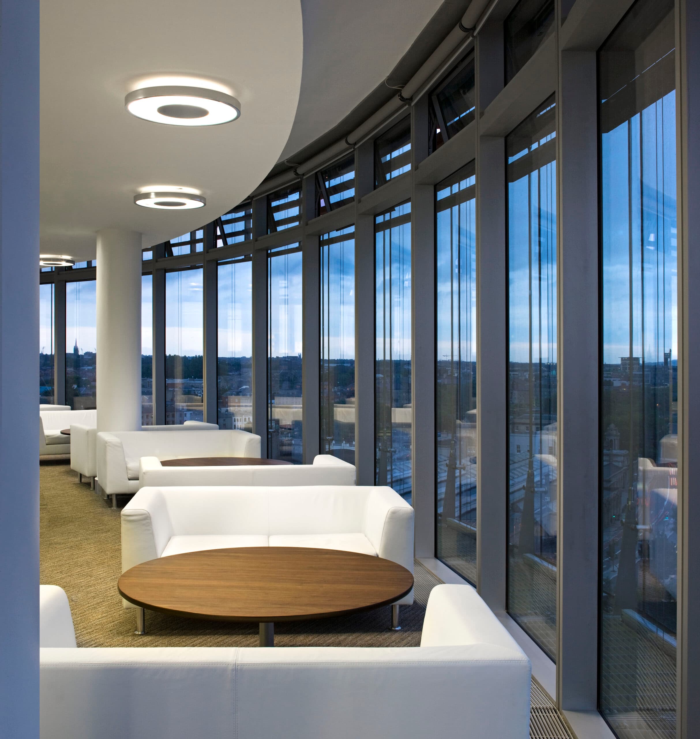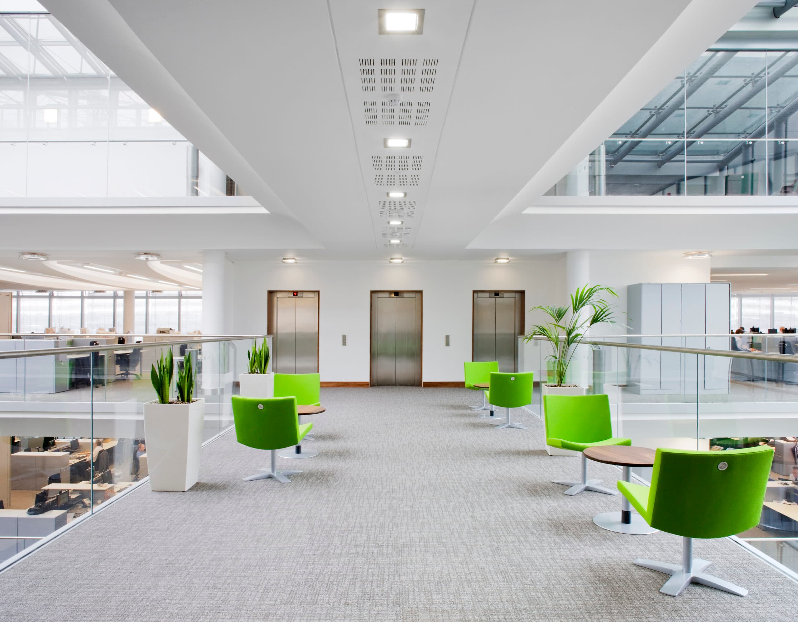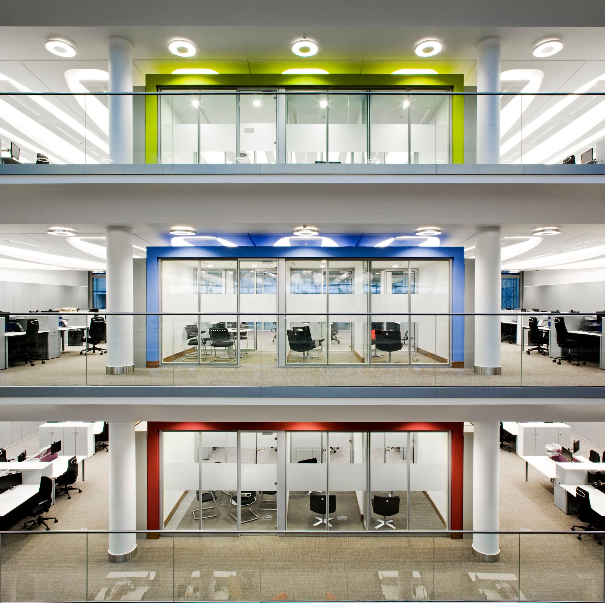 Three main office areas are housed within the building, each with a depth of 15 meters, separated by service zones across six floors on either side of a central atrium. These areas are designed to be easily divided into two separate buildings, if needed. The transition from traditional individual offices to a fully open-plan work environment was made smoother by incorporating distinct zones based on a neighbourhood concept.