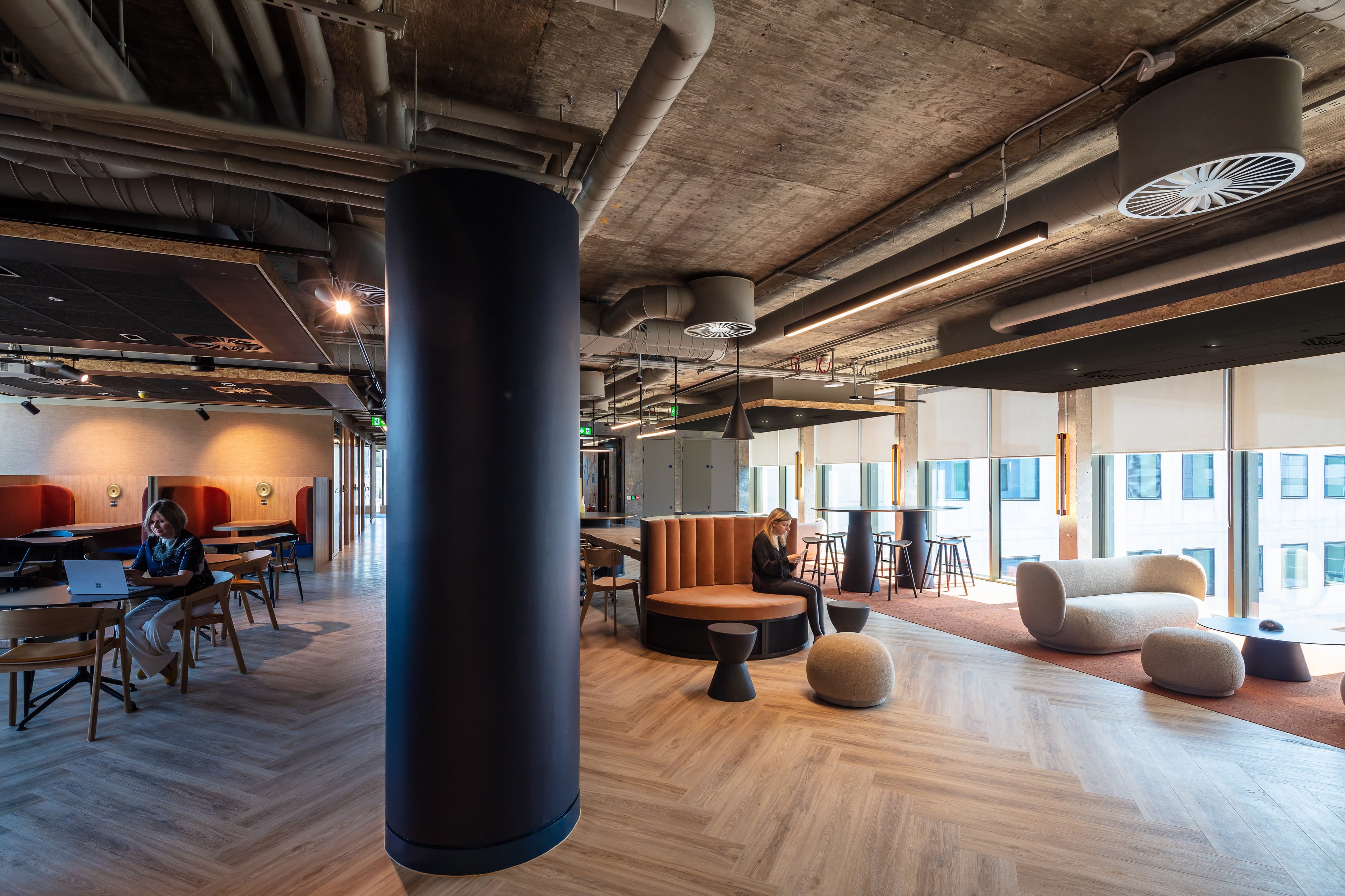 Three main office areas are housed within the building, each with a depth of 15 meters, separated by service zones across six floors on either side of a central atrium. These areas are designed to be easily divided into two separate buildings, if needed. The transition from traditional individual offices to a fully open-plan work environment was made smoother by incorporating distinct zones based on a neighbourhood concept.