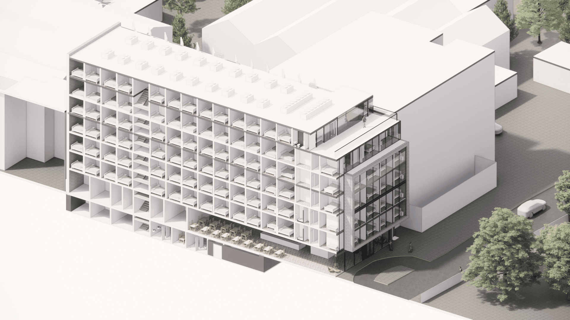 The outcome is a contemporary hotel that effectively meets all stipulated requirements through the implementation of innovative and strategic design solutions, thereby maximising the project's overall functionality and aesthetic appeal.