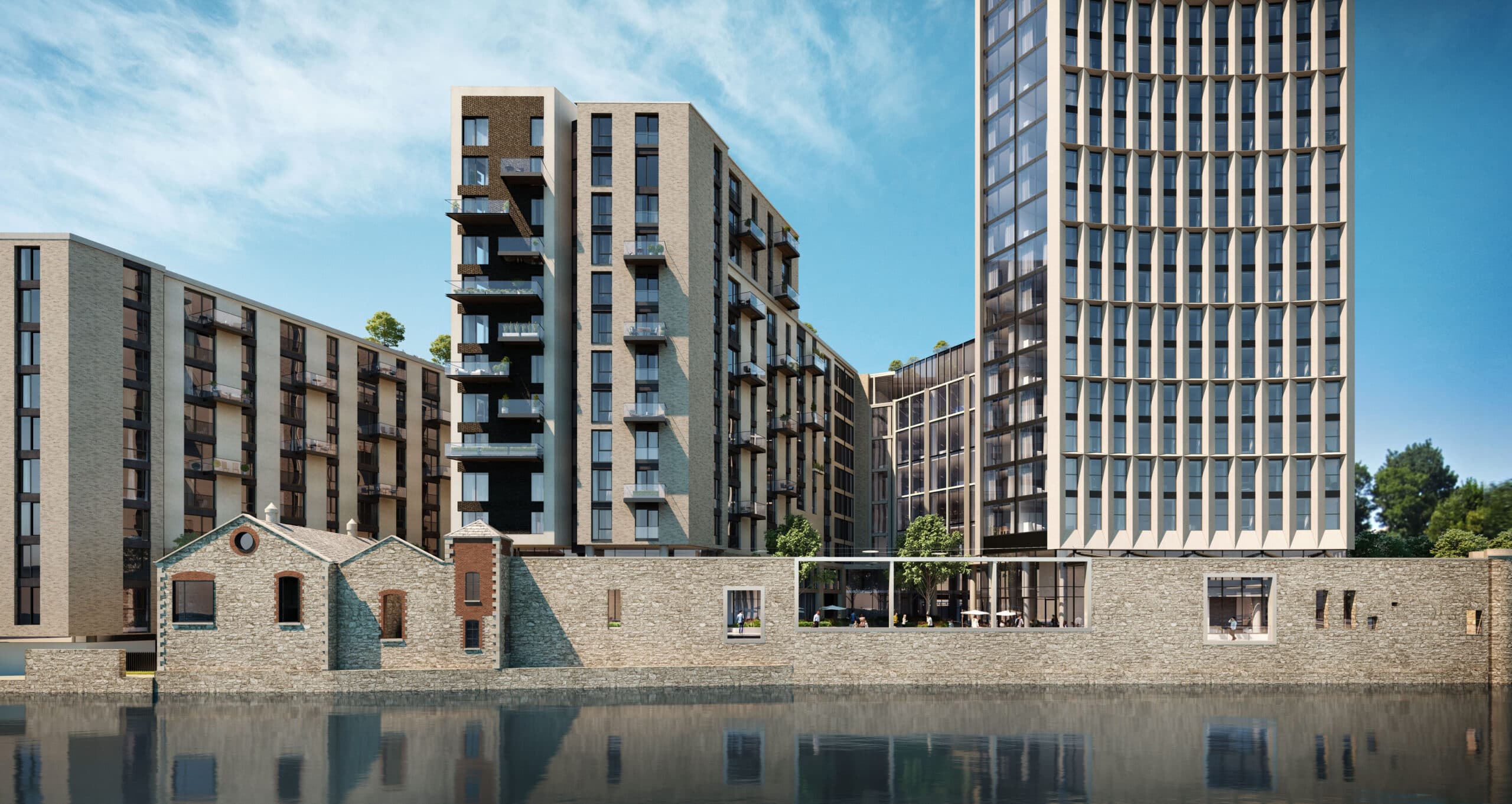 Unlike other riverfront developments in Dublin, the site is not cut off from the Liffey by the flow of traffic. A considered design embraces the opportunity to open up urban spaces along the riverfront for both residents and the community to enjoy. Proposed buildings in the development make visual connections to neighbouring landmarks such as the Criminal Courts of Justice, Heuston Station, Kilmainham and the entrance to the Phoenix Park.