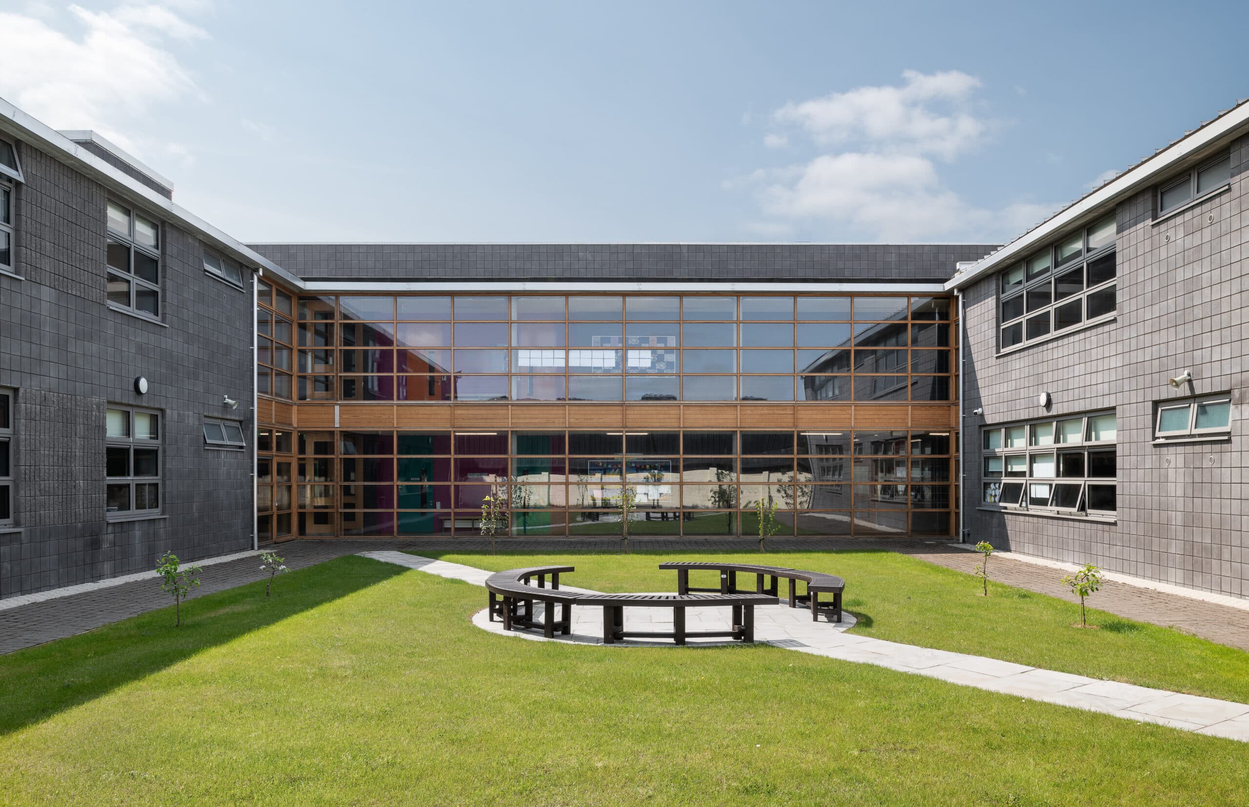 St. Columba’s is a long narrow site and has a shared access roadway with St Columba’s Girl’s National Schools. In response to the narrow plot the building has an elongated footprint which is arranged around a series of courtyards.