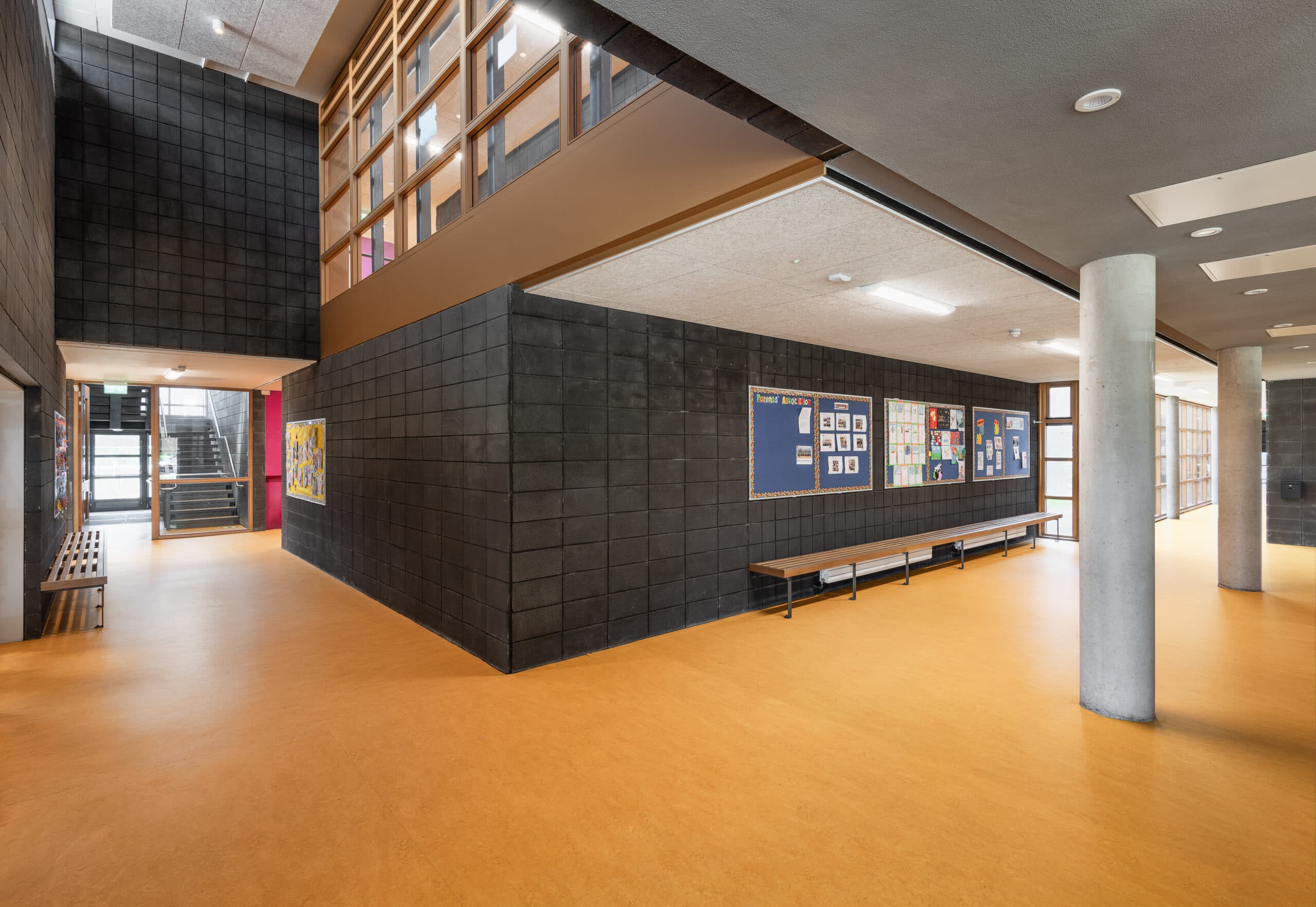 The entrance thresholds of each classroom are signified with a distinctive burst of colour. Ancillary accommodations are assigned neutral door colours. Staff rooms are identifiable with glass blockwork. Steel stairs, timber curtain walling and wood wool ceilings add to the richness of texture and colour of the common areas. In contrast the teaching spaces are painted flush pointed blockwork. The windows to all teaching spaces are metal. The classroom furniture matches the burst of colour at the doorways which individualises the parts within the whole.
