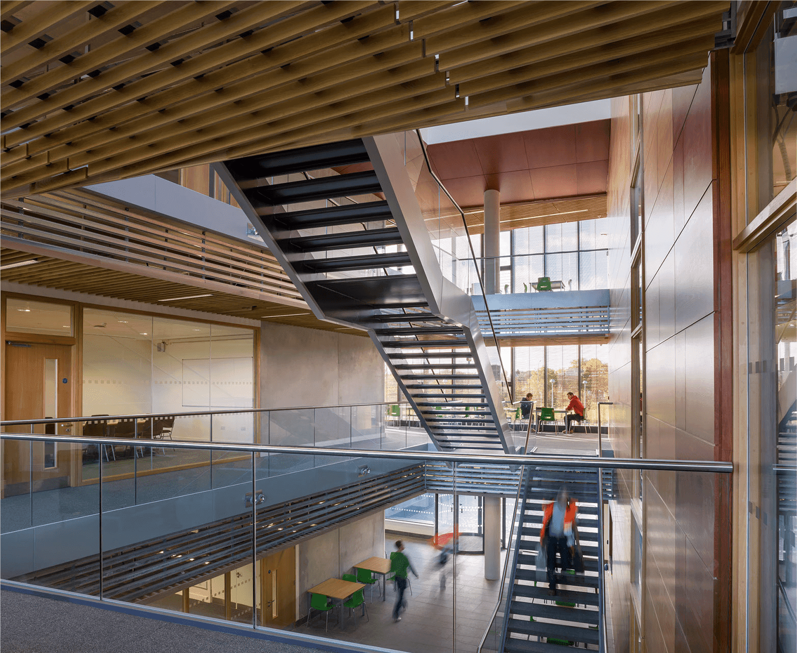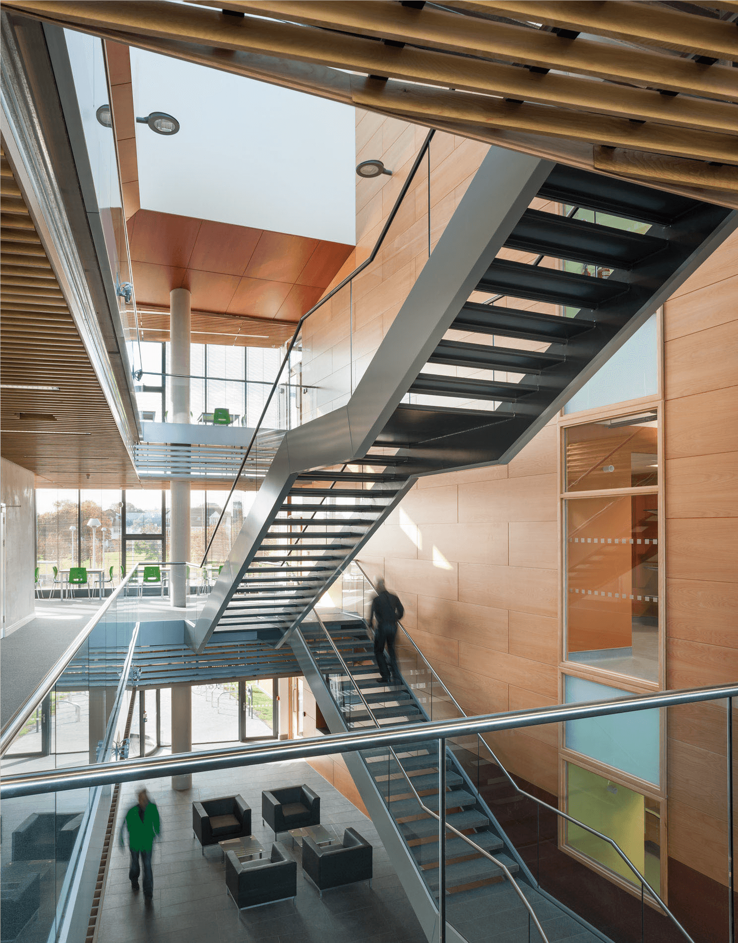 The BSRB was constructed to the highest standards, fully NZEB compliant and a BER A rated building with a Breeam Very Good rating. Façades incorporate an innovative approach to solar shading in the use of Oakwood glazing with integral timber blinds, which provided inherent heat reduction to the naturally ventilated external western corridor. The atrium, office suites, technical work areas and perimeter corridors are all naturally ventilated, acting as a “thermal sweater” for the mechanically ventilated laboratory suites and reinforce an extremely energy efficient design strategy.